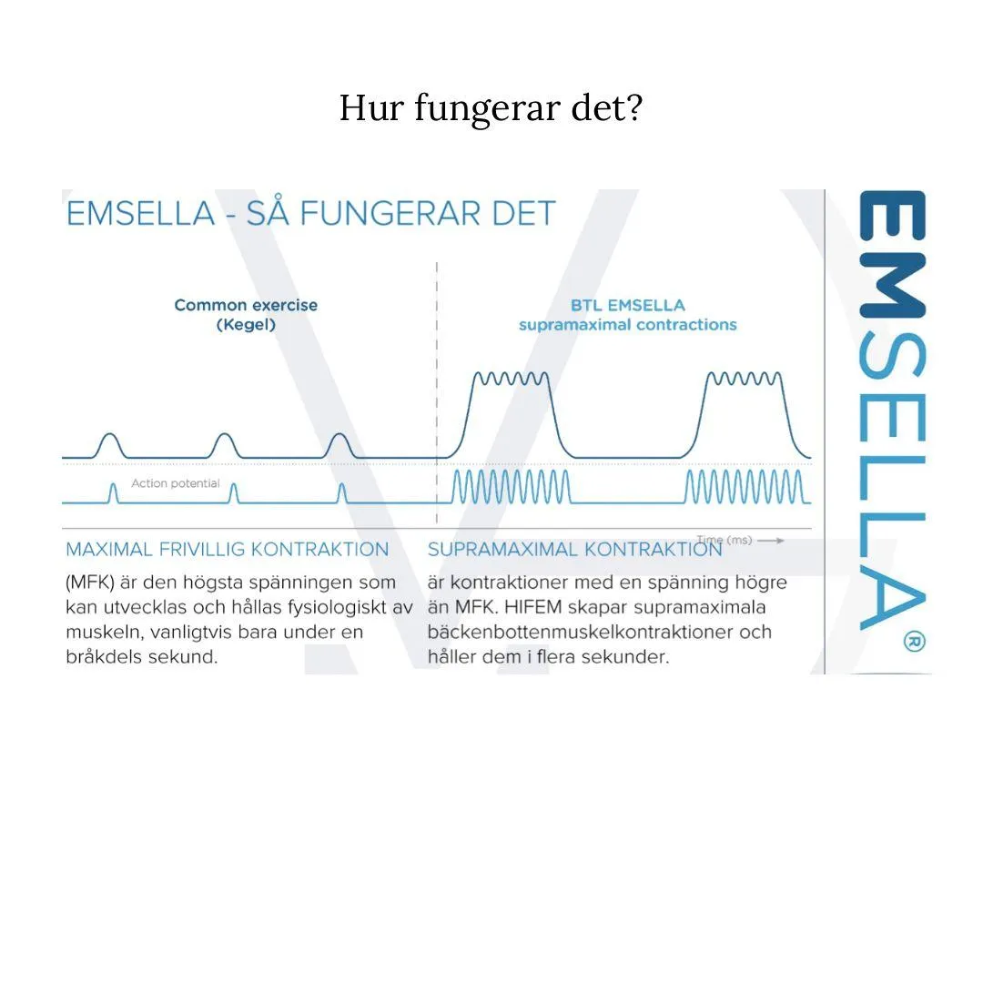 Emsella använder högintensiv elektromagnetisk fokuserad energi (HIFEM) för att skapa starka muskelkontraktioner. Emsella bygger upp och stärker din bäckenbottenmuskulatur.